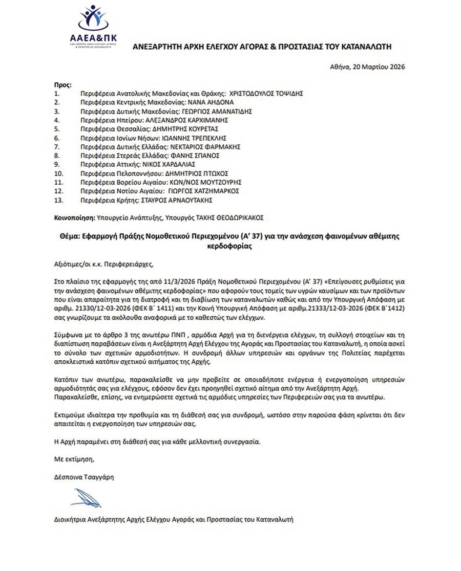 Πάμε παρακάτω για να καταλάβετε το χάος και την απόλυτη «γύμνια». Η κ. Τσαγγάρη, λοιπόν, που την έστειλε ο Θεοδωρικάκος στα πλατό για να μαζέψει τα ασυμμάζευτα, είναι το ίδιο άτομο που υπέγραψε το «απαγορευτικό» στους ελέγχους της επαρχίας! Ναι! Ενώ η κυβέρνηση, με την ΠΝΠ της 11ης Μαρτίου 2026 τής έδωσε την απόλυτη αρμοδιότητα, εκείνη φαίνεται πως ζαλίζεται μόλις περάσει τα διόδια της Αττικής.
