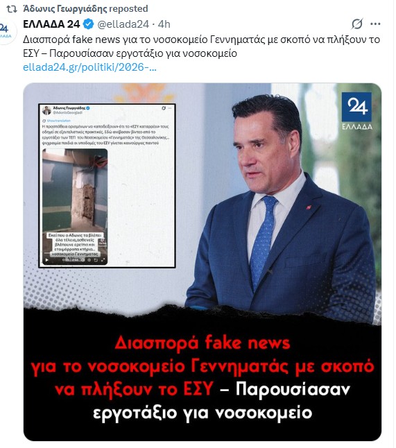 Μένω στον μαγικό κόσμο των fake news. «Βιομηχανία», για την ακρίβεια, που μάλιστα δουλεύει υπερωρίες! Χθες κάποιοι επιτήδειοι στοχοποίησαν το ΕΣΥ και τον Άδωνι Γεωργιάδη. Τι συνέβη; Κυκλοφόρησε ένα βίντεο-ντοκουμέντο (!!!) που έδειχνε ντουβάρια και μπάζα, με τους γνωστούς επιτηδείους να ουρλιάζουν ότι πρόκειται για το «Γεννηματάς» της Αθήνας. Μόνο που η αλήθεια τους… έμπαζε από παντού. Πρώτον, το κτίριο ήταν στη Θεσσαλονίκη και, δεύτερον, ο χώρος δεν ήταν θάλαμος ασθενών αλλά ένα κλειστό εργοτάξιο που αναβαθμίζεται! Για να καταλάβετε, η προπαγάνδα κατέρρευσε όταν στην ίδια την εικόνα φάνηκε η πινακίδα που απαγόρευε την είσοδο λόγω εργασιών! Φυσικά ο Άδωνις, που δεν αφήνει τέτοιες «πάσες» να πέσουν κάτω, βγήκε αμέσως στα social media και ξεμπρόστιασε τη στοχευμένη δυσφήμηση, αποδεικνύοντας ότι κάποιοι βαφτίζουν τα έργα εκσυγχρονισμού «διάλυση». Προσοχή λοιπόν στο μοντάζ των ψεκασμένων!