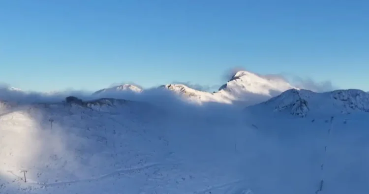 Το βίντεο δείχνει τις χιονισμένες πλαγιές και κορυφές, προμηνύοντας μια καθαρά χειμωνιάτικη σεζόν.