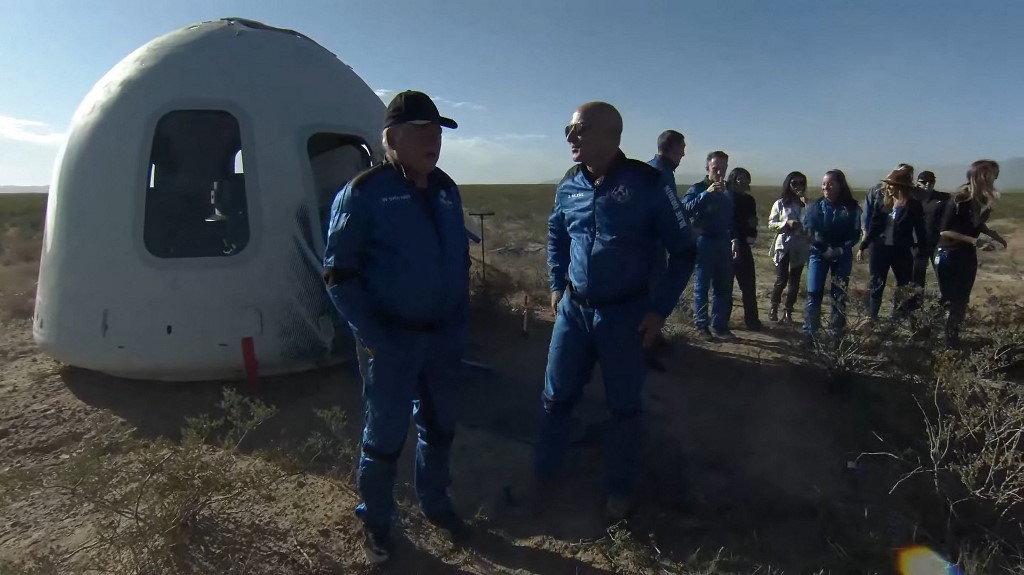Ο προωθητικός πύραυλος προσγειώθηκε όρθιος σε φορτηγίδα, 600 χλμ. ανοιχτά των ακτών με τον Τζεφ Μπέζος να παρακολουθεί τη δράση από το κέντρο ελέγχου εκτόξευσης.