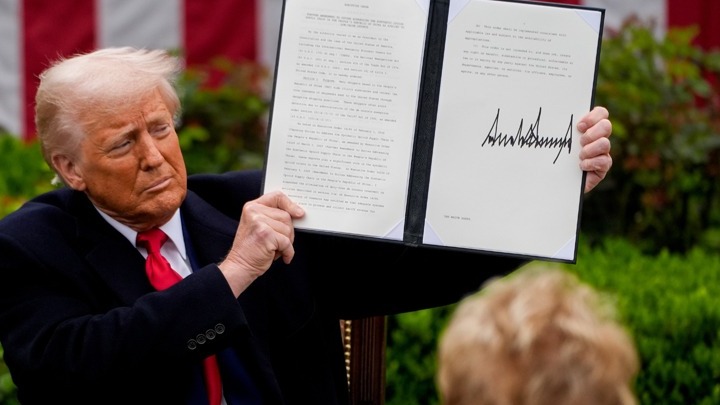 Ο αμερικανός πρόεδρος Ντόναλντ Τραμπ υπέγραψε χθες Πέμπτη το εκτελεστικό διάταγμα με το οποίο επιβάλλονται υψηλότεροι τελωνειακοί δασμοί, που θα πλήξουν προϊόντα από δεκάδες χώρες του κόσμου, μέτρο με σκοπό «να αναδομηθεί το παγκόσμιο εμπόριο προς όφελος των αμερικανών εργαζομένων», όπως διαβεβαίωσε ο Λευκός Οίκος σε έγγραφό του.