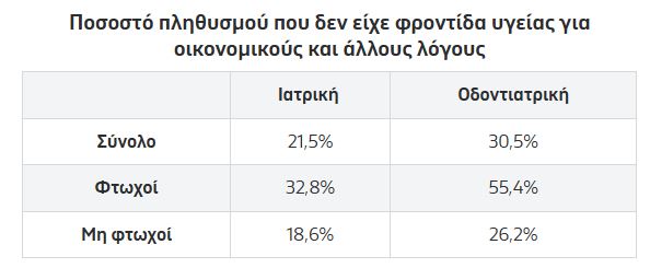 Οι διαφορές στην πρόσβαση γίνονται ακόμη πιο εμφανείς όταν εξετάζονται ανάλογα με το οικονομικό επίπεδο. Στα χαμηλότερα εισοδήματα, περίπου ένας στους τρεις δεν μπορεί να πραγματοποιήσει ιατρική εξέταση ή θεραπεία, ενώ πάνω από τους μισούς δεν έχουν τη δυνατότητα να επισκεφθούν οδοντίατρο. Το χάσμα ανάμεσα σε φτωχότερους και πιο εύπορους πολίτες παραμένει έντονο, με βασικές ανάγκες υγείας να μετατρέπονται σε «πολυτέλεια» για τους οικονομικά ευάλωτους.