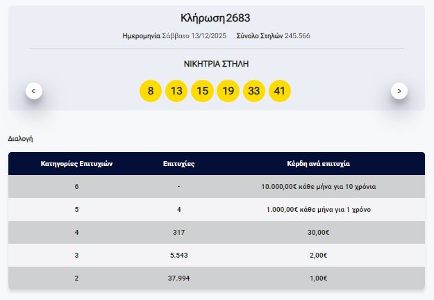 Στην κλήρωση ΛΟΤΤΟ αριθμός 2683, σήμερα Σάββατο 13 Δεκεμβρίου 2025 οι τυχεροί αριθμοί είναι: 13, 41, 33, 15, 19, 8. <img class="alignnone size-full wp-image-50806" src="https://epolitical.gr/wp-content/uploads/2025/12/kl.jpg" alt="" width="625" height="432" />