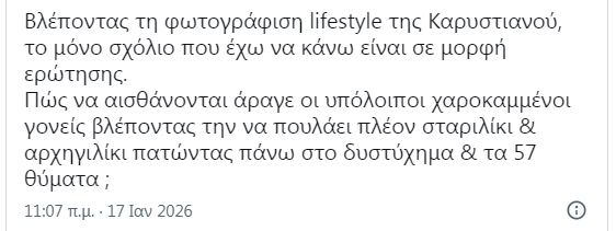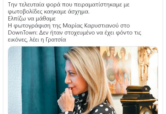 Πολλοί χρήστες στα social media γράφουν ότι η Μαρία Καρυστιανού δεν έχει πλέον την εικόνα μιας μάνας που πενθεί και πως η φωτογράφιση στο Down Town δεν δείχνει ένα τέτοιο πρόσωπο.