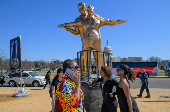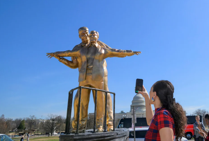 Στην καρδιά της Ουάσινγκτον, κοντά στο Καπιτώλιο, ξεπρόβαλε ένα γλυπτό που δεν αφήνει κανέναν αδιάφορο: ο Ντόναλντ Τραμπ και ο Τζέφρι Έπσταϊν αναπαριστώνται στη θρυλική σκηνή του «Τιτανικού», με τον Τραμπ ως «Τζακ» πίσω από τον Έπσταϊν-«Ρόουζ» στην πλώρη του πλοίου, χαμογελαστοί σαν ερωτευμένο ζευγάρι!