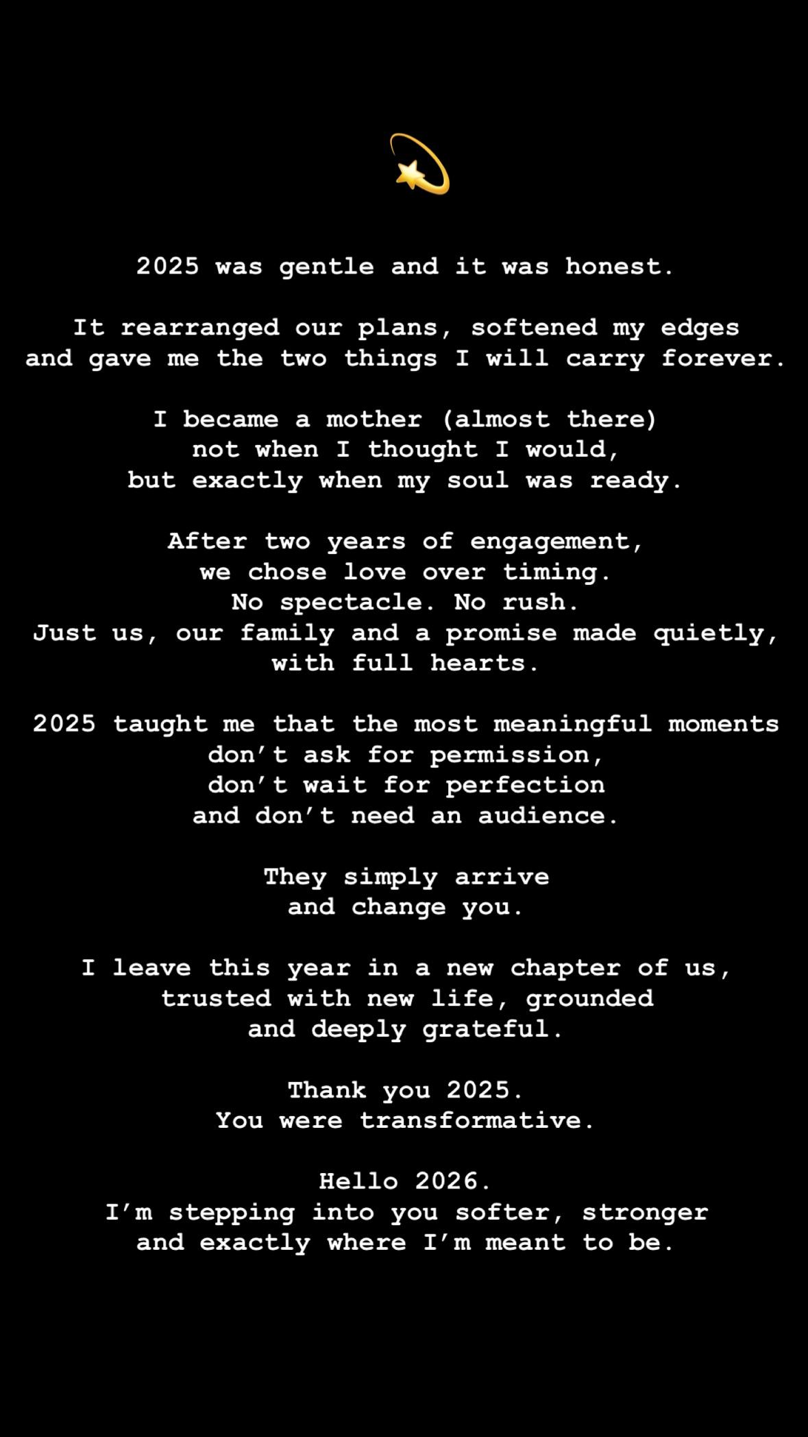 Το 2025 μού έμαθε ότι οι πιο ουσιαστικές στιγμές δεν ζητούν άδεια, δεν περιμένουν την τελειότητα και δεν χρειάζονται κοινό, απλώς έρχονται και σε αλλάζουν. Αφήνω αυτή τη χρονιά σε ένα νέο κεφάλαιο για εμάς, με νέα ζωή, γειωμένη και βαθιά ευγνώμων.