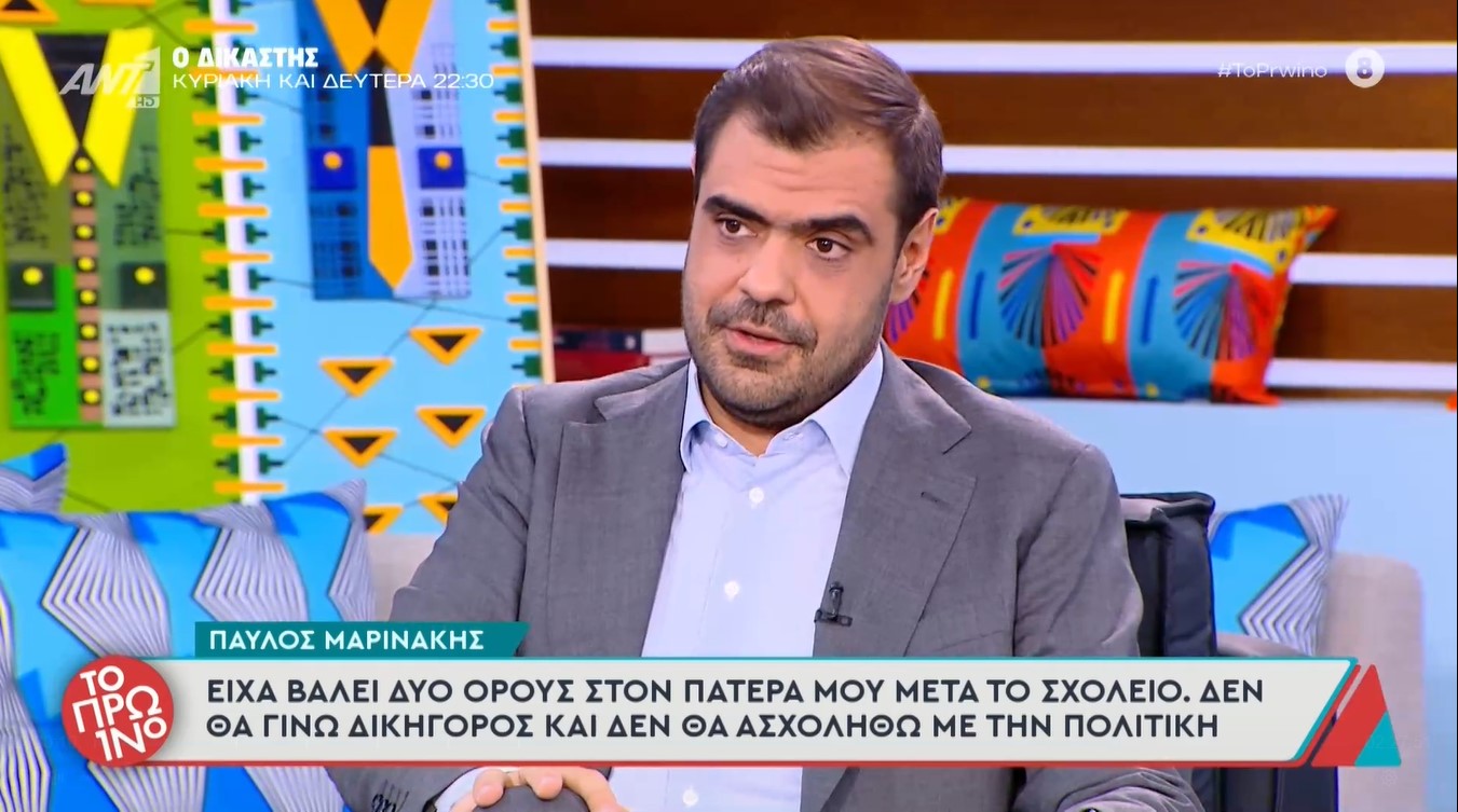 Ο κυβερνητικός εκπρόσωπος Παύλος Μαρινάκης φιλοξενήθηκε σήμερα στο «Πρωινό» του ΑΝΤ1 και μιλώντας στον Γιώργο Λιάγκα προχώρησε σε μεγάλες αποκαλύψεις: «Αυτή η θέση, που πολλές φορές έχει χαρακτηριστεί ως ηλεκτρική καρέκλα, έχει αρκετά κοινά με τη δικηγορία. Πρέπει να επιμένεις, να προβάλλεις τα θετικά που έχει κάνει μια κυβέρνηση.