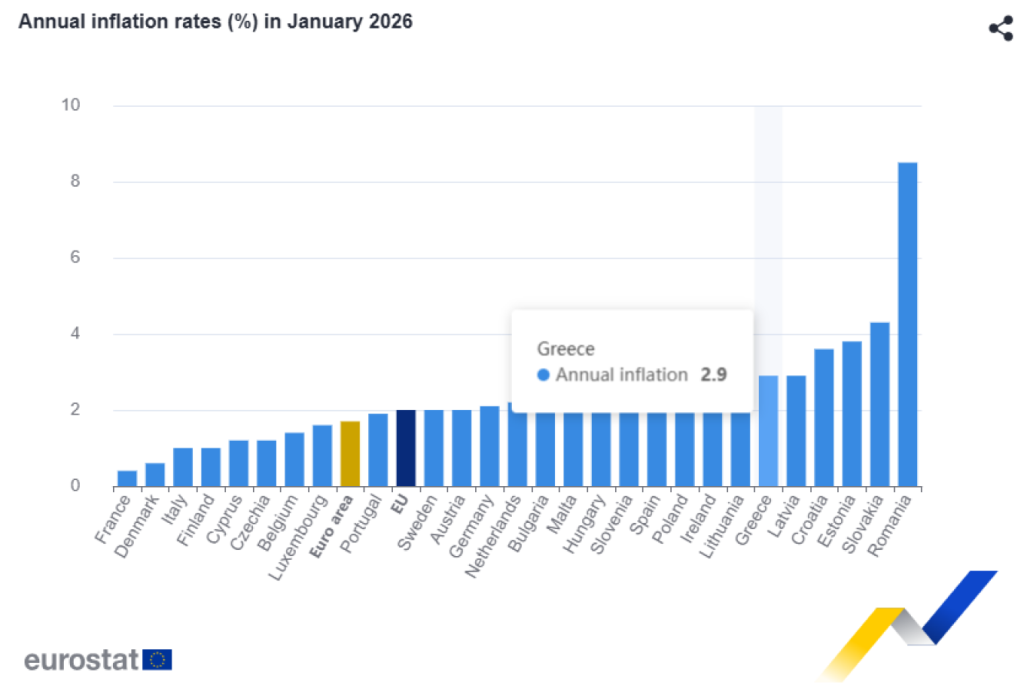 Τον έκτο υψηλότερο πληθωρισμό είχε η Ελλάδα το φετινό Ιανουάριο ανάμεσα στις 27 χώρες – μέλη της Ευρωπαϊκής Ενωσης.