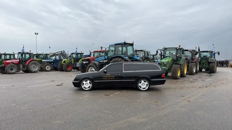 Ιδιαίτερη εικόνα αποτέλεσαν οι αγρότες δίπλα στα τρακτέρ, πανό και… πολυτελείς μαύρες λιμουζίνες τελευταίου «ταξιδιού».