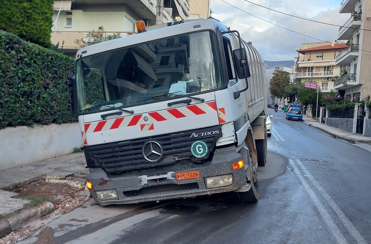Απορριμματοφόρο του Δήμου Αγίου Δημητρίου που εκτελούσε εργασίες έπεσε σε λακκούβα στην οδό Λιδωρικίου με τον δήμαρχο, Στέλιο Μαμαλάκη, να αποδίδει το γεγονός σε διαρροή, λόγω βλάβης – όπως λέει – στο δίκτυο της ΕΥΔΑΠ.