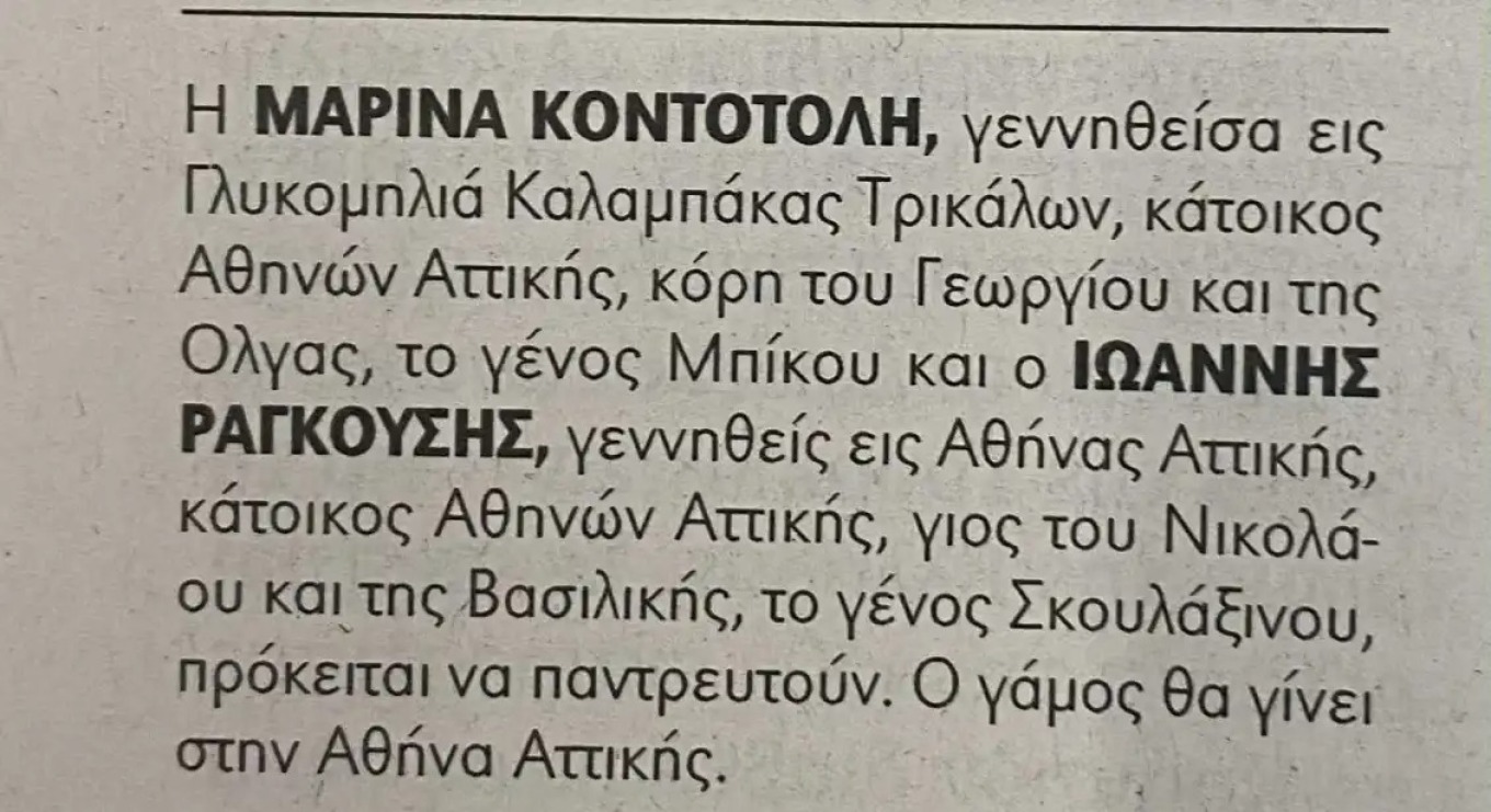 Ο λόγος για τον Γιάννη Ραγκούση, ο οποίος παντρεύεται τη βουλευτή του ΣΥΡΙΖΑ, Μαρίνα Κοντοτόλη.
