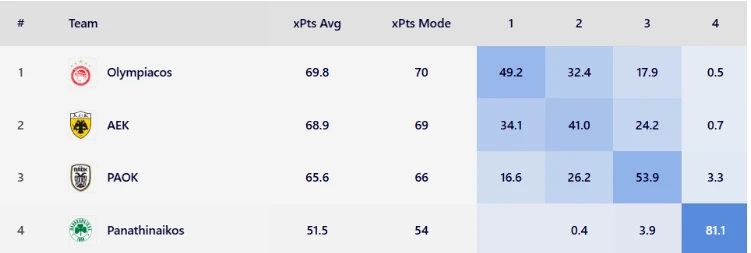 Το Football Meets Data επιχειρεί να δώσει μια εικόνα για το ποιος έχει τις περισσότερες πιθανότητες να τερματίσει πρώτος. Τα ποσοστά όμως, όσο εντυπωσιακά κι αν φαίνονται, δεν αποτυπώνουν πάντα τη δυναμική της στιγμής.