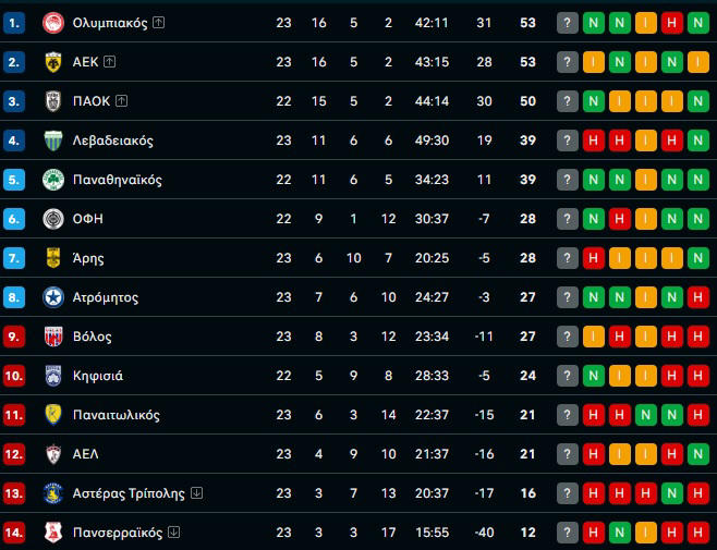 Και ενώ οι δύο «μονομάχοι» βρίσκονται πλέον αγκαλιά στην πρώτη θέση, ο ΠΑΟΚ παραμονεύει στους 50 βαθμούς, έχοντας όμως ένα παιχνίδι λιγότερο. Το εξ’ αναβολής ματς με την Κηφισιά (04/03, εκτός έδρας) μπορεί να αποδειχθεί καταλύτης. Αν ο «Δικέφαλος του Βορρά» πάρει τη νίκη, τότε δημιουργείται τριπλή ισοβαθμία που τινάζει τη βαθμολογία στον αέρα και μετατρέπει τις τελευταίες αγωνιστικές σε πραγματικό θρίλερ.