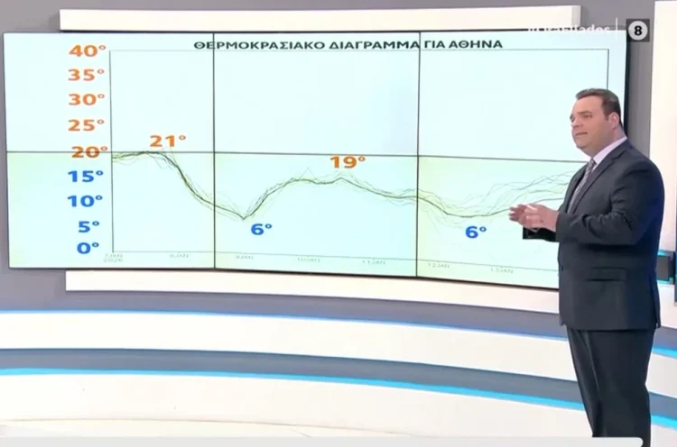 Ο μετεωρολόγος Κλέαρχος Μαρουσάκης προβλέπει ότι αύριο τα ξημερώματα η θερμοκρασία θα πέσει αισθητά, με μέγιστη γύρω στους 6 βαθμούς Κελσίου στο κέντρο της Αθήνας.