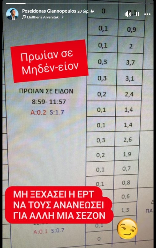 Οι χθεσινές μετρήσεις τηλεθέασης έδειξαν (και πάλι) χαμηλά νούμερα, που κυμαίνονταν από 0,1 έως 0,3, γεγονός που δεν πέρασε απαρατήρητο από τον ραδιοφωνικό παραγωγό και παρουσιαστή  Ποσειδώνα Γιαννόπουλο.
