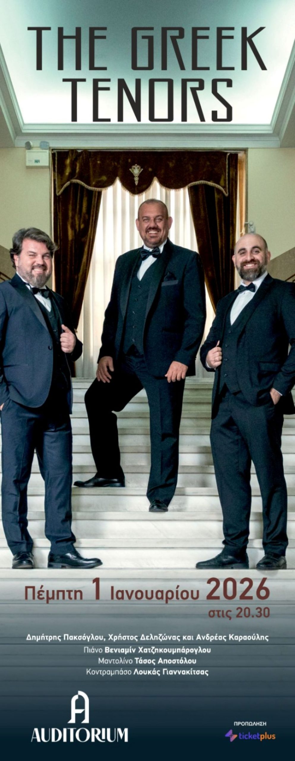 Οι Τρεις Έλληνες Τενόροι, Δημήτρης Πακσόγλου, Χρήστος Δεληζώνας και Ανδρέας Καραούλης, σας προσκαλούν να υποδεχθείτε το 2026 με μια εντυπωσιακή γιορτή μουσικής την Πέμπτη 1 Ιανουαρίου, στο καινούριο Auditorium Χώρος Τεχνών.