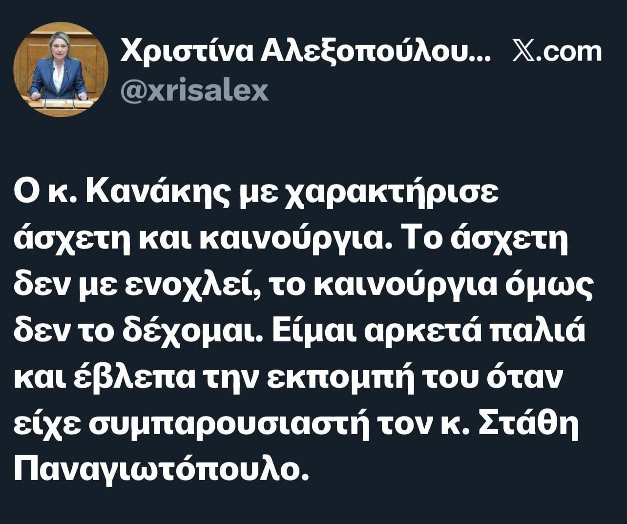 Σε δημόσια τοποθέτησή της, υπογράμμισε ότι μπορεί να αγνοεί επιδεικτικά την ειρωνεία περί «ασχετοσύνης», ωστόσο δεν δέχεται να παρουσιάζεται ως «καινούργια», λες και εμφανίστηκε χθες στον δημόσιο βίο.