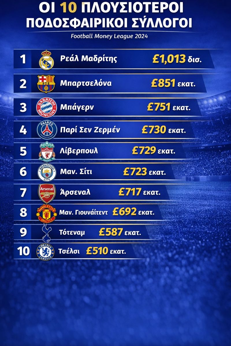 Η Ρεάλ Μαδρίτης κατέγραψε για δεύτερη συνεχόμενη χρονιά τα υψηλότερα έσοδα παγκοσμίως, φτάνοντας τα 1,013 δισ. λίρες. Οι «μερένγκες» είχαν ήδη γράψει ιστορία πέρσι ως η πρώτη ομάδα που ξεπέρασε το 1 δισ. ευρώ, επιβεβαιώνοντας τη σταθερή οικονομική τους υπεροχή.