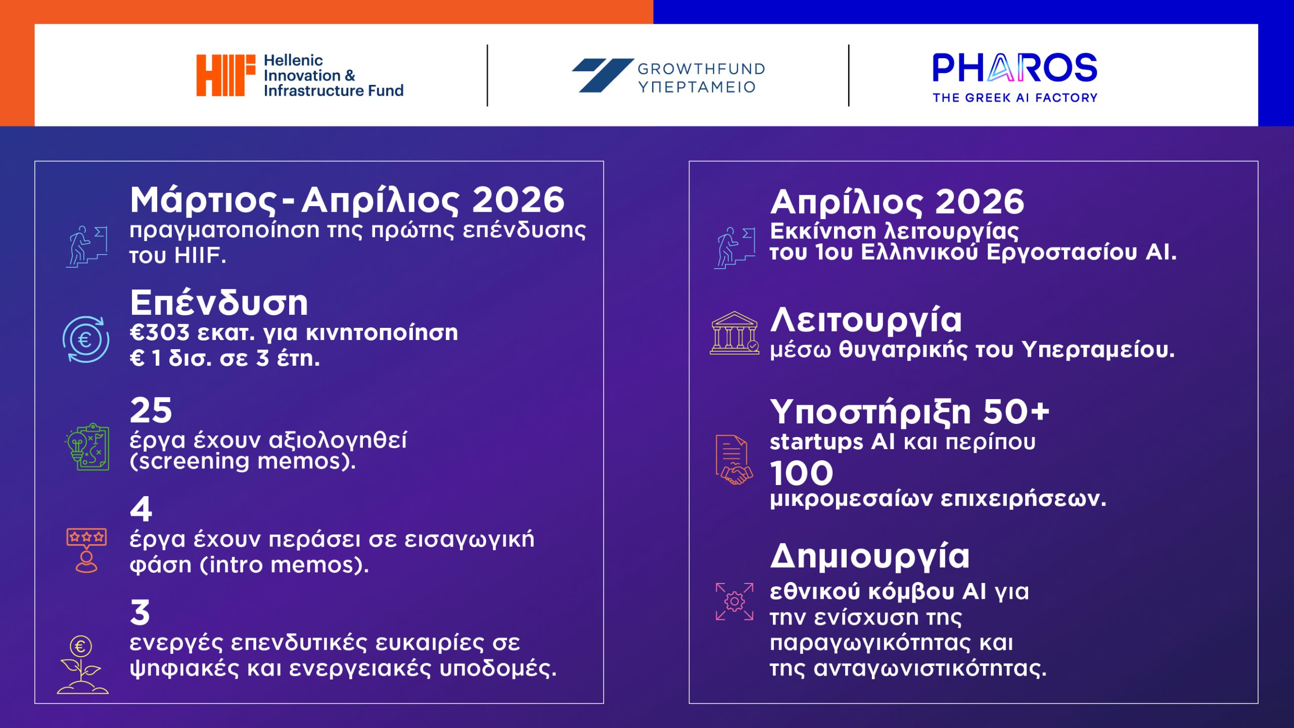 Κομβικό ρόλο αναλαμβάνει το νέο Ελληνικό Επενδυτικό Ταμείο Καινοτομίας & Υποδομών (HIIF), με στόχο την κινητοποίηση κεφαλαίων 1 δισ. ευρώ σε τομείς όπως η ενεργειακή μετάβαση και οι ψηφιακές υποδομές. Παράλληλα, δρομολογείται η λειτουργία του πρώτου εργοστασίου Τεχνητής Νοημοσύνης PHAROS, σε συνεργασία με το Υπουργείο Ψηφιακής Διακυβέρνησης.