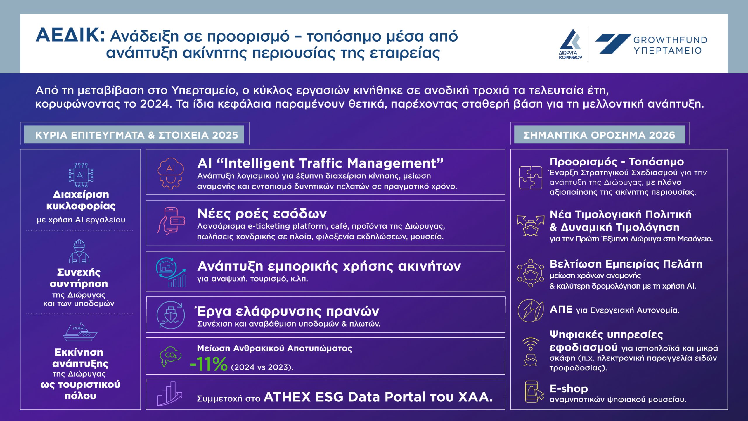 Ο διευθύνων σύμβουλος Γιάννης Παπαχρήστου και ο αναπληρωτής διευθύνων σύμβουλος Παναγιώτης Σταμπουλίδης παρουσίασαν το Στρατηγικό Σχέδιο 2025-2027. Σύμφωνα με τη διοίκηση, την επόμενη τριετία τα οργανικά κέρδη εκτιμώνται σε 1 δισ. ευρώ και τα μερίσματα προς το Δημόσιο σε 700 εκατ. ευρώ, ενώ μέσω της Μονάδας Στρατηγικών Συμβάσεων (PPF) προγραμματίζονται δημοπρατήσεις έργων ύψους 1 δισ. ευρώ το 2026.