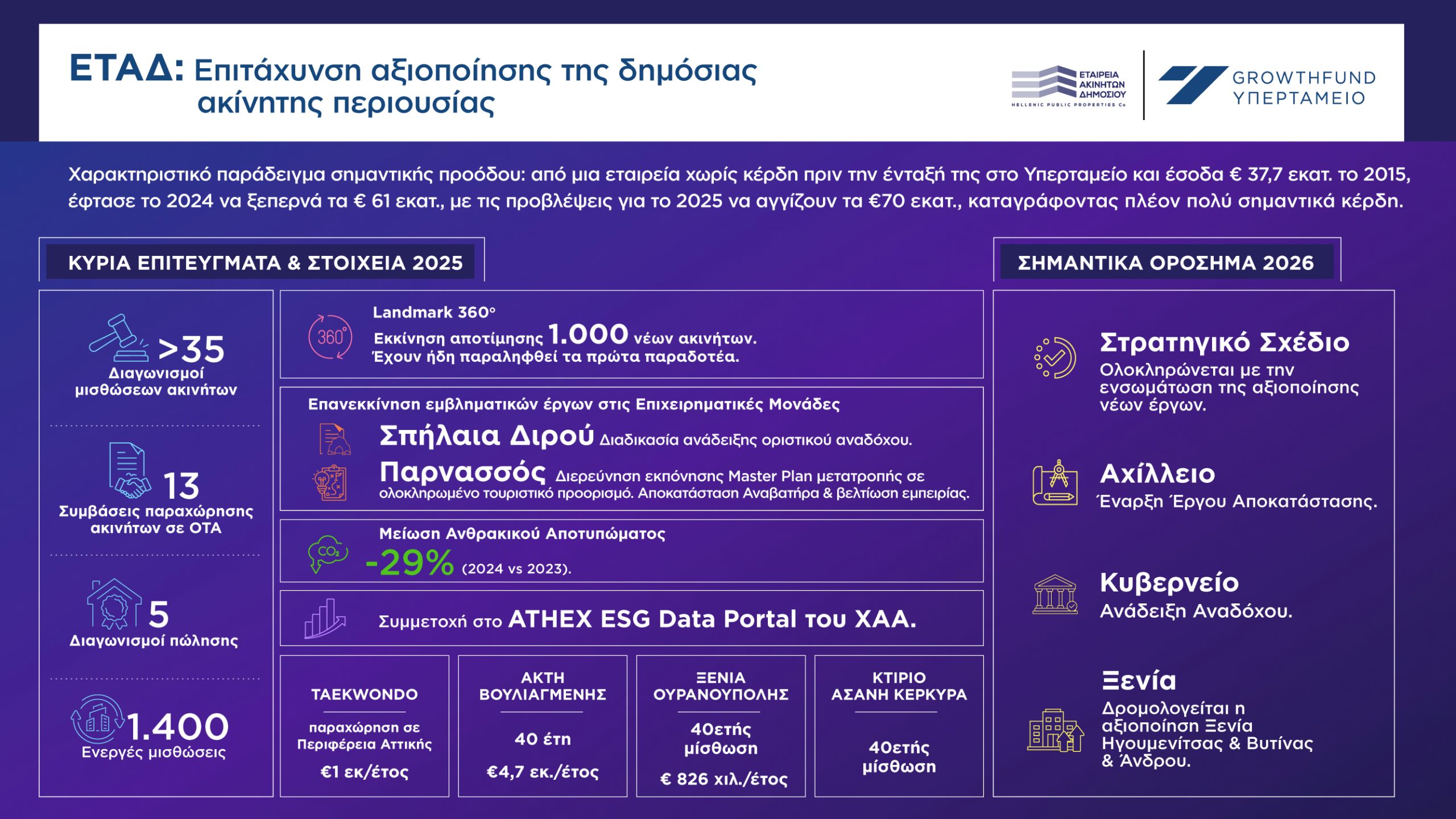 Στον τομέα της ακίνητης περιουσίας, δρομολογείται η αξιοποίηση εμβληματικών ακινήτων και η ωρίμανση 20.000 εγγραφών και άνω των 4.500 αποτιμήσεων έως το 2027, διαμορφώνοντας σαφή εικόνα της αξίας της δημόσιας περιουσίας.