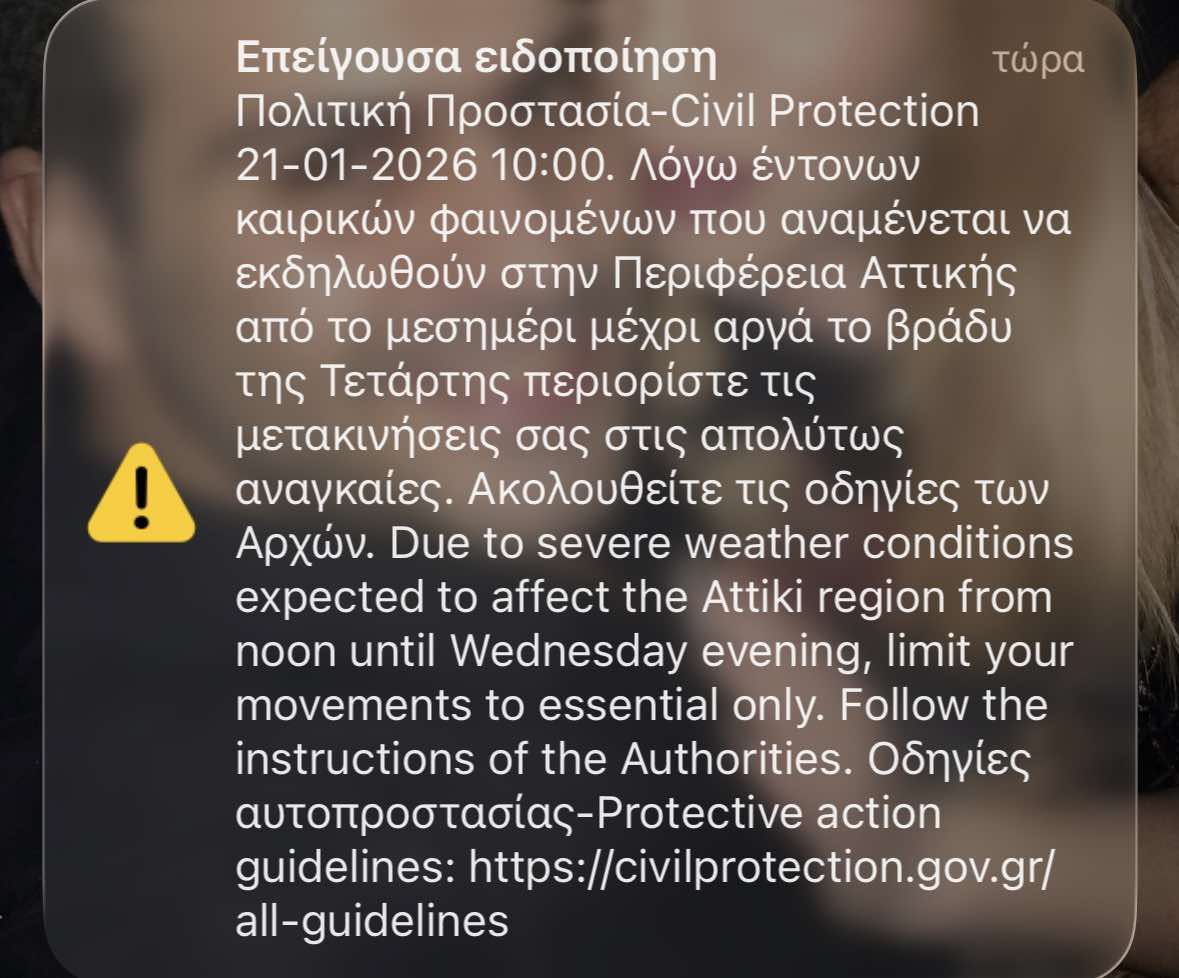 Το 112 ήχησε τώρα στην Αττική με προειδοποίηση της πολιτικής προστασίας για επικίνδυνα καιρικά φαινόμενα.