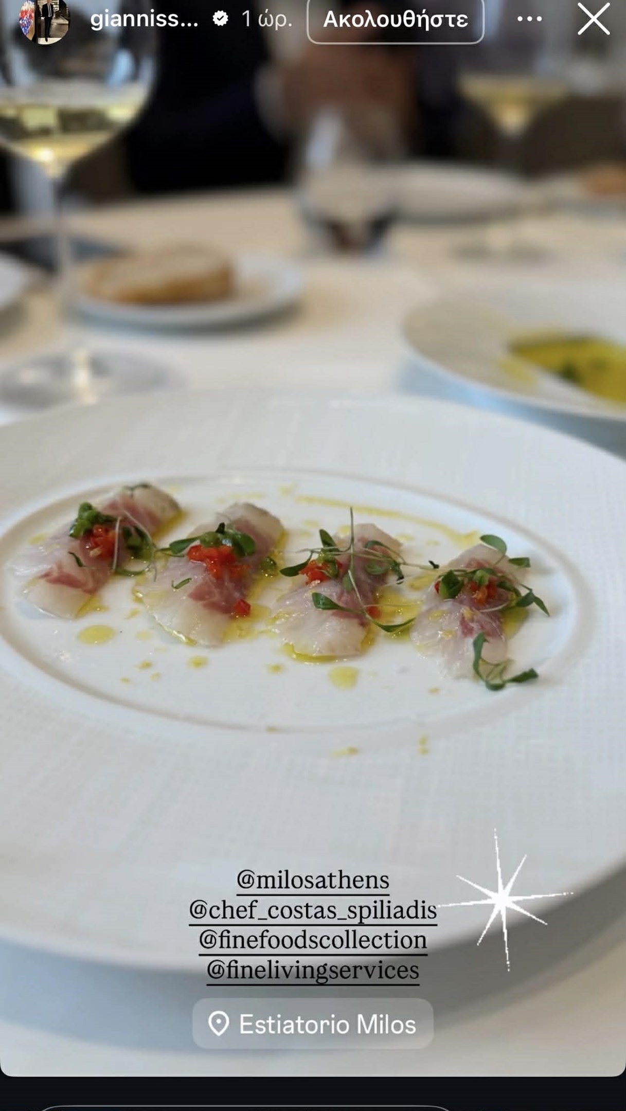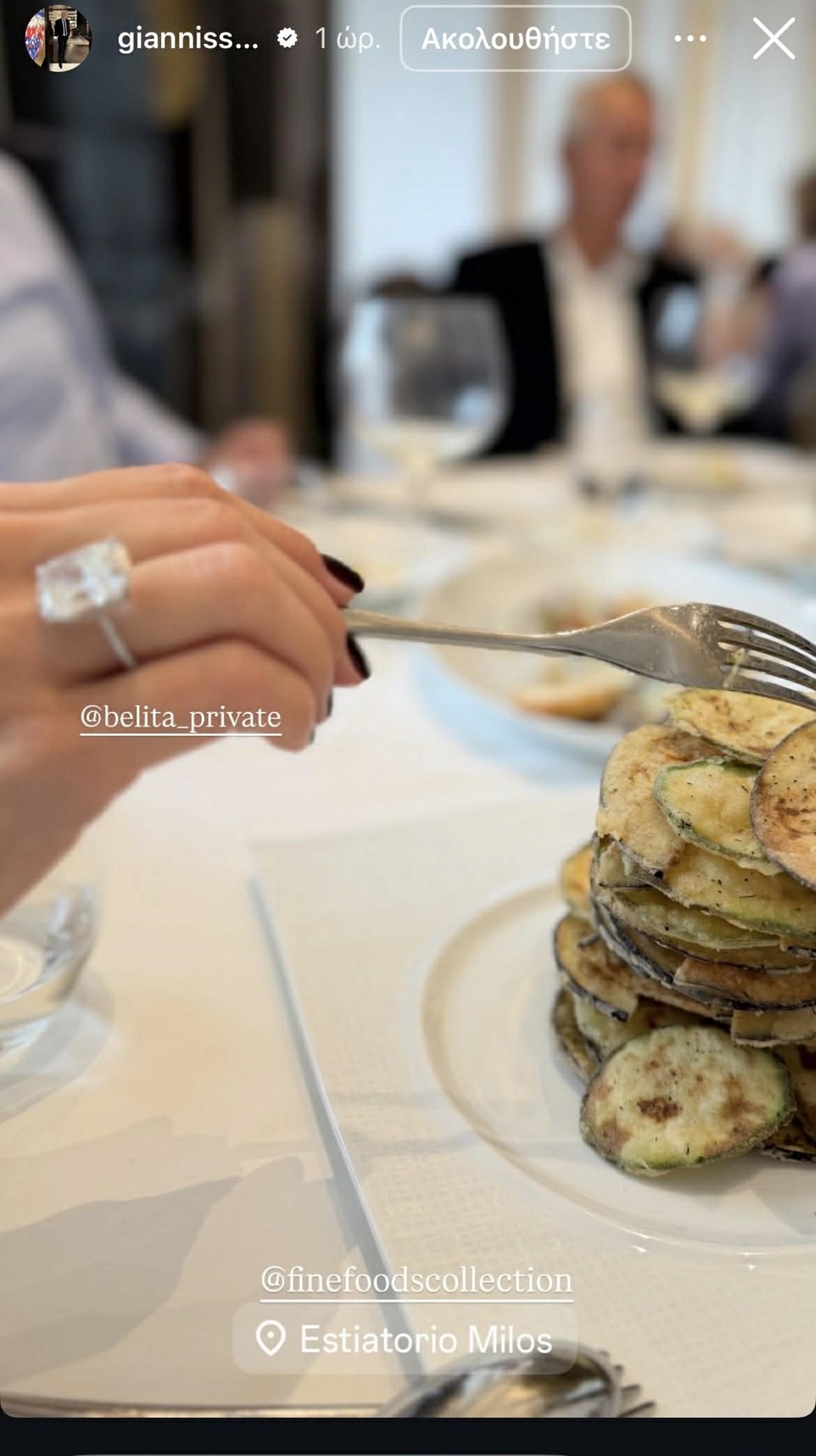 Στη συνέχεια, η Δήμητρα και ο Γιάννης Κούστας δείπνησαν σε εστιατόριο υψηλής γαστρονομίας στο κέντρο της Αθήνας με τον στενό τους φίλο και κουμπάρο, Γιάννη Στασινόπουλο, ο οποίος και μοιράστηκε στιγμιότυπα της βραδιάς στα social media. Το μονόπετρο, πάντως, έκλεψε την παράσταση.