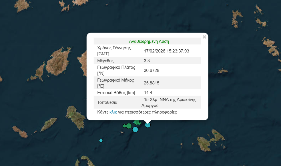 Σεισμική δόνηση μεγέθους 3,3 Ρίχτερ σημειώθηκε το απόγευμα της Τρίτης 17 Φεβρουαρίου, στα ανοιχτά της Αμοργού.