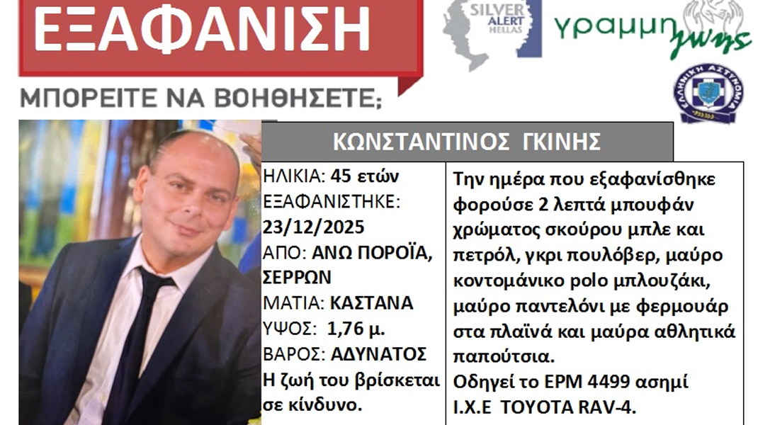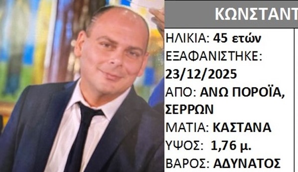 Υπενθυμίζεται ότι ο 45χρονος αποχώρησε από το σπίτι του στα Άνω Πορόια το πρωί της 23ης Δεκεμβρίου, οδηγώντας αυτοκίνητο που ανήκει στη μητέρα του, χωρίς να έχει μαζί του το κινητό του τηλέφωνο, τραπεζικές κάρτες ή άλλα προσωπικά αντικείμενα.