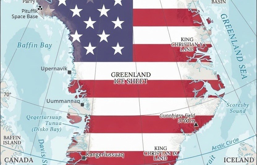Σκηνικό «τεντωμένου σχοινιού» με χάρτη της Γροιλανδίας καλυμμένο με αμερικανική σημαία