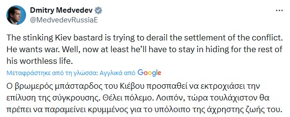 Στην ανάρτησή του, ο Μεντβέντεφ επιτέθηκε λεκτικά χαρακτηρίζοντας τον Ζελένσκι «μπά…ρδο του Κιέβου» και υποστηρίζοντας ότι θα πρέπει να κρύβεται για το υπόλοιπο της ζωής του.