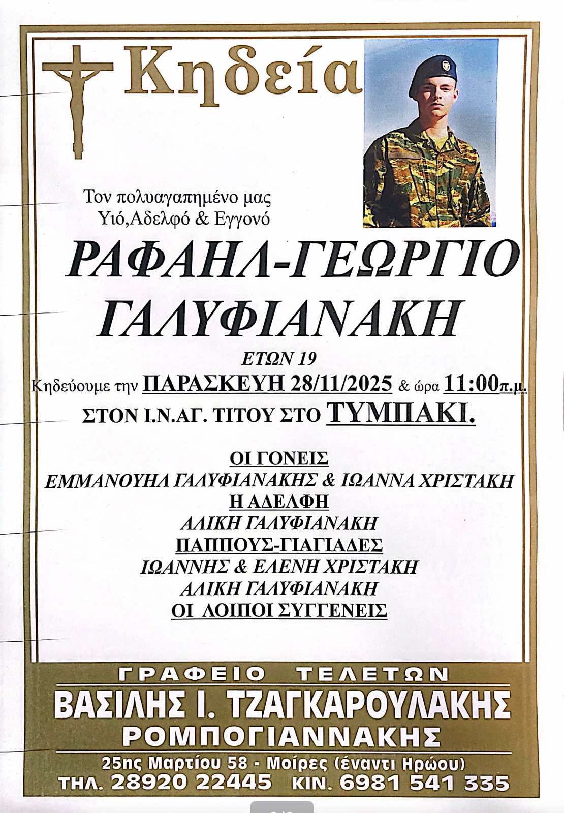 «Καλό ταξίδι παλικάρι... καλό ταξίδι ΓΙΕ ΜΟΥ...»- Αύριο στο Τυμπάκι η κηδεία του Ραφαήλ Γαλυφιανάκη