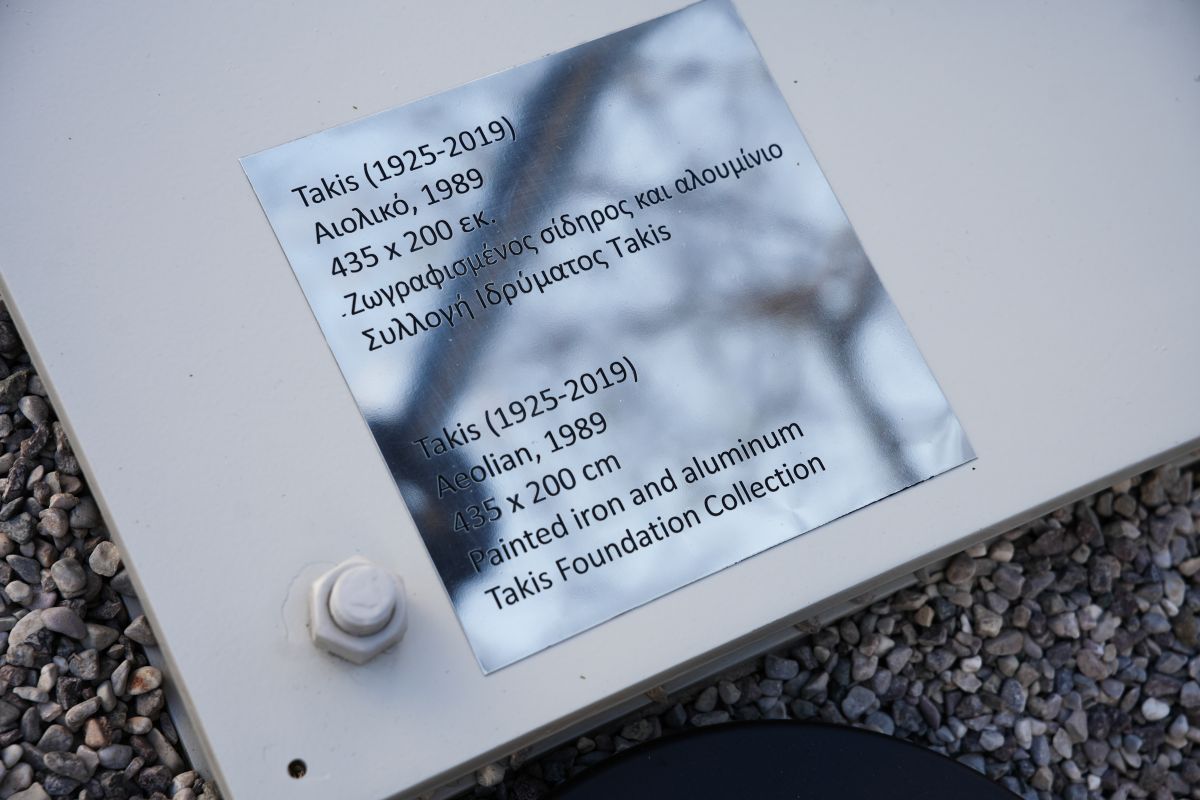 Η δημιουργία «Αιολικό» είναι ένα επιβλητικό μεταλλικό γλυπτό, με ύψος 4,35 μέτρων, κατασκευασμένο από σίδηρο και αλουμίνιο. Έχει σαφή στοιχεία από τις βασικές επιρροές του Takis, όπως η αιολική ενέργεια, η φύση και η κίνηση. Το έργο λειτουργεί ως σήμα που αντιδρά με το φύσημα του αέρα, προσφέροντας μια μοναδική εμπειρία και αναδεικνύει την πρωτοποριακή προσέγγιση της ελληνικής γλυπτικής.