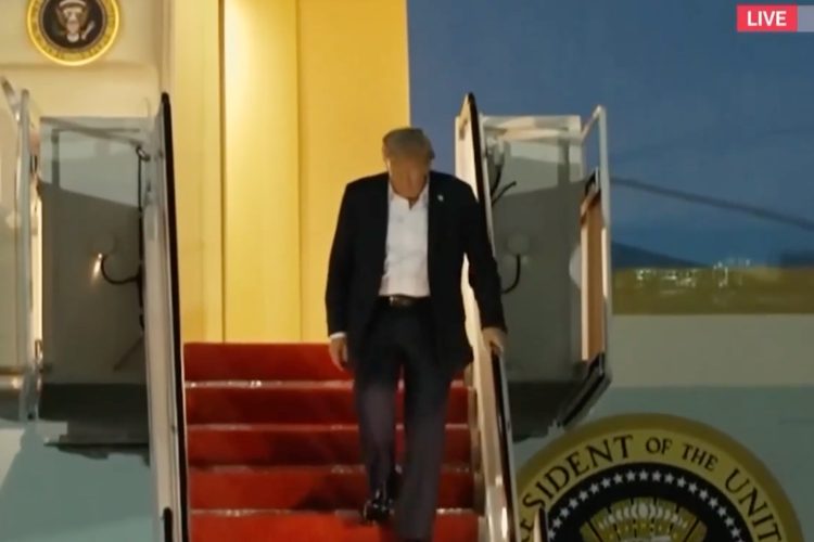 Στις Ηνωμένες Πολιτείες επέστρεψε πριν από λίγο ο πρόεδρος Ντόναλντ Τραμπ, έπειτα από την πολύωρη συνάντηση που είχε στην Αλάσκα με τον Βλαντιμίρ Πούτιν. Κατεβαίνοντας από το Air Force One, εμφανίστηκε κουρασμένος, χωρίς γραβάτα και με βλέμμα χαμηλωμένο.