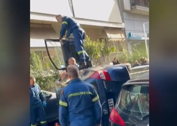Η στιγμή που απεγκλωβίζουν τον οδηγό από τουμπαρισμένο αυτοκίνητο στον Βύρωνα (VIDEO)