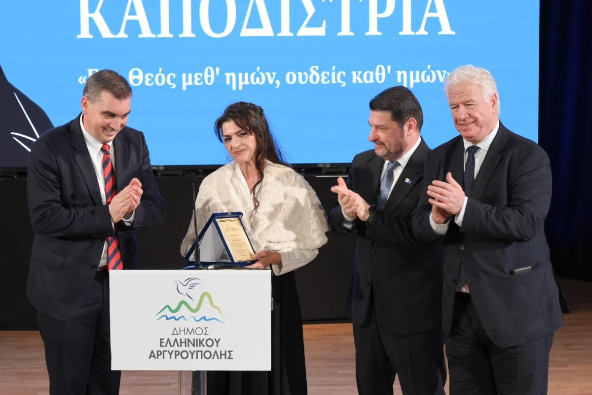 Σημαντική στιγμή της εκδήλωσης αποτέλεσε η προβολή του αφιερώματος στον Γιάννη Σμαραγδή, ο οποίος βραβεύτηκε για την προσφορά του, ανακηρύσοντας τον Επίτιμο Δημότη Ελληνικού – Αργυρούπολης. Ο σκηνοθέτης εξέφρασε τη συγκίνησή του, τονίζοντας τη σημασία της αποκατάστασης του Καποδίστρια στη συνείδηση του λαού.