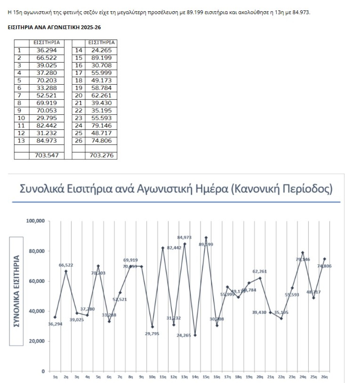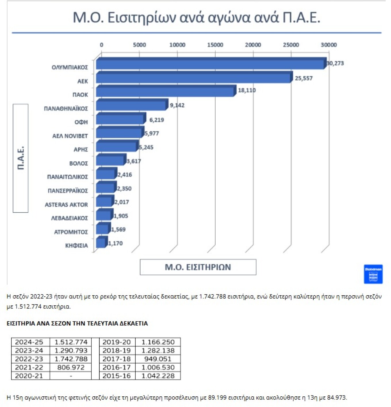 Η αύξηση είναι σημαντική σε σχέση με την περσινή περίοδο, όταν είχαν διατεθεί 1.182.478 εισιτήρια, με μέσο όρο 6.497 ανά παιχνίδι. Μέχρι πρότινος, η καλύτερη επίδοση της δεκαετίας καταγραφόταν τη σεζόν 2023-24 με 7.683 θεατές ανά αγώνα, ενώ η χαμηλότερη είχε σημειωθεί τη χρονιά 2021-22, στον απόηχο της πανδημίας.