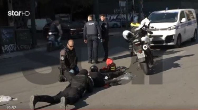 O αστυνομικός της ομάδας ΔΙΑΣ ξάπλωσε μέσα στη μέση της Πατησίων και μίλησε με τον οδηγό μίας μοτοσικλέτας, ο οποίος λίγο πριν είχε ένα τροχαίο ατύχημα.