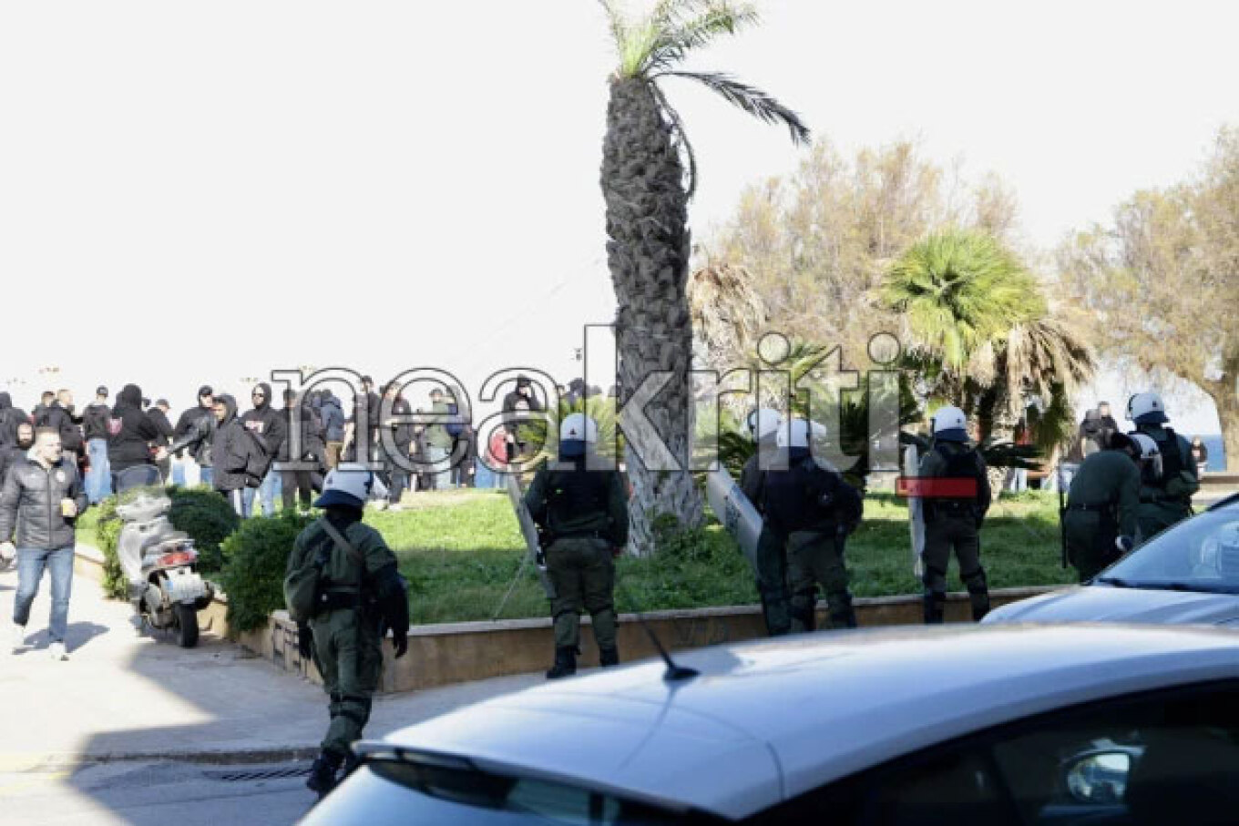 Παρά την εκτεταμένη και διακριτική παρουσία αστυνομικών, σημειώθηκαν επεισόδια χαμηλής έντασης στην περιοχή γύρω από το Ιστορικό Μουσείο Κρήτης, το οποίο είχε οριστεί ως σημείο συγκέντρωσης για τη μετακίνηση των φιλάθλων των «ερυθρόλευκων» προς το γήπεδο.