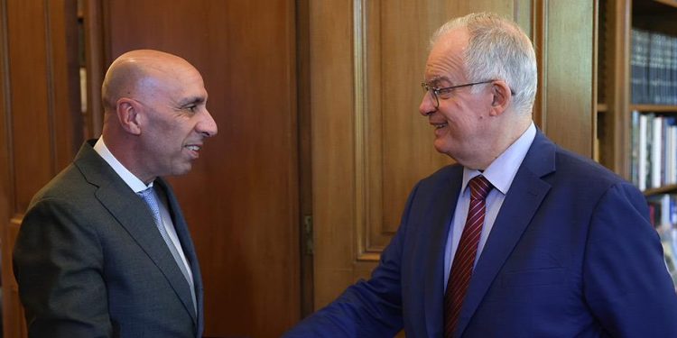 Υπόμνημα με τις βασικές θέσεις και προτάσεις του ΕΒΕΑ για την ανασυγκρότηση και τον παραγωγικό μετασχηματισμό της ελληνικής οικονομίας παρέδωσε σήμερα ο πρόεδρος του Εμπορικού και Βιομηχανικού Επιμελητηρίου Αθηνών, Γιάννης Μπρατάκος, στον Πρόεδρο της Ελληνικής Δημοκρατίας, Κωνσταντίνο Τασούλα.