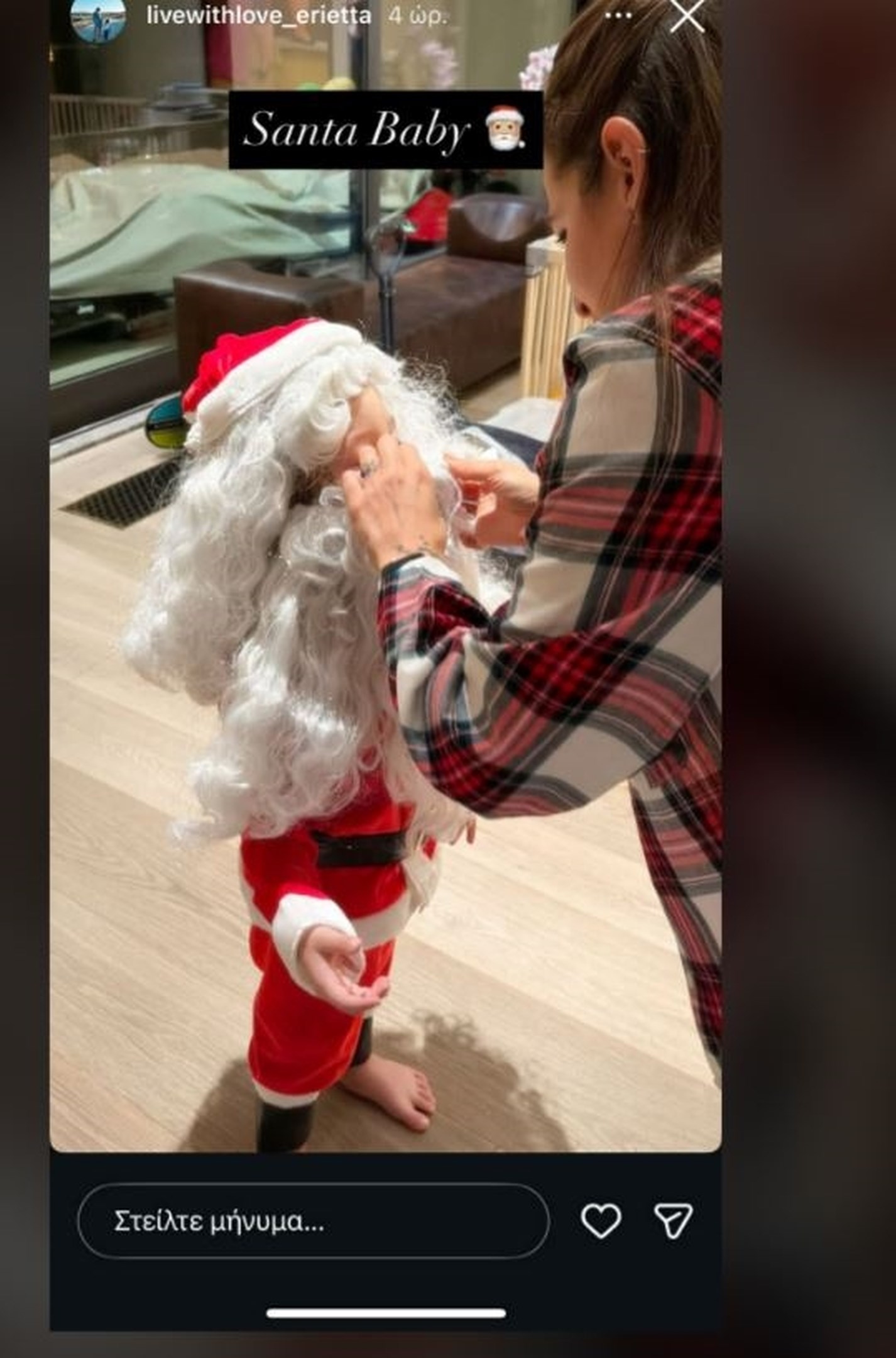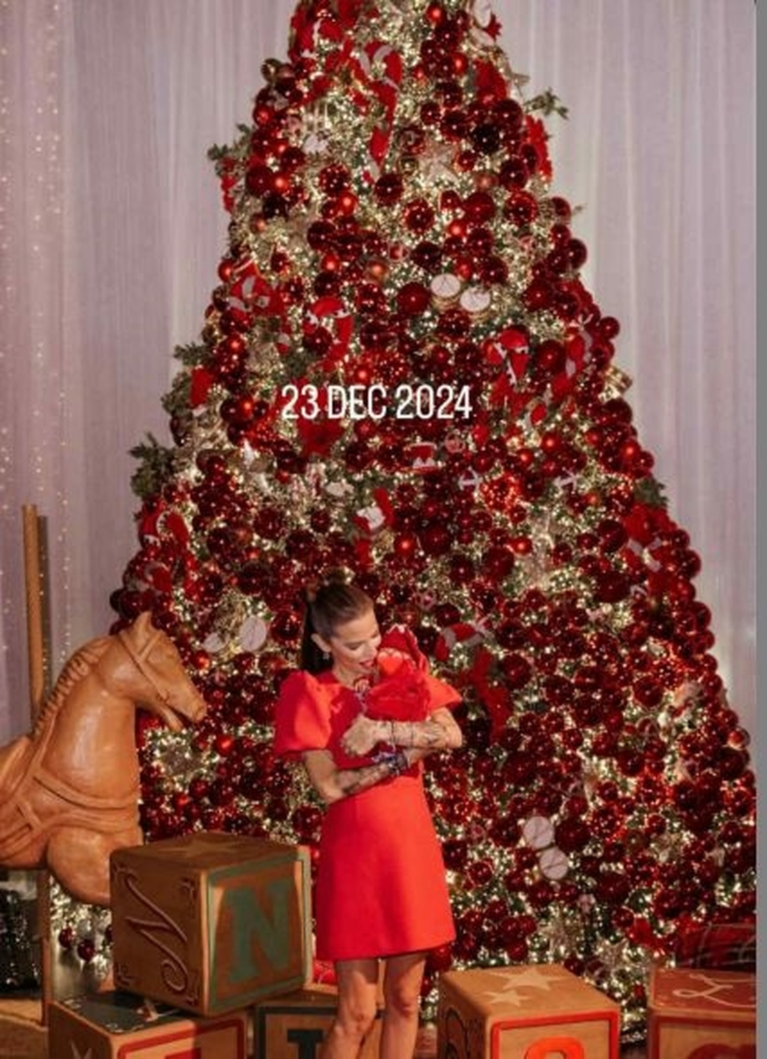 Ανάμεσα στα στιγμιότυπα, ξεχώρισε εκείνο στο οποίο η Εριέττα πόζαρε αγκαλιά με το μωράκι της μπροστά από το πανύψηλο χριστουγεννιάτικο δέντρο με τις κόκκινες μπάλες και τα περίτεχνα στολίδια.