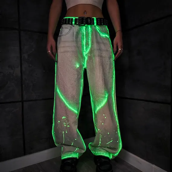 Όταν το σκοτάδι πέφτει… τα τζιν ανάβουν! Τα glow‑in‑the‑dark jeans είναι ένα trend που βρήκε απήχηση κυρίως στο festival fashion και στις street outfits, με denim που φωτίζεται στη νύχτα σαν φορητή ντισκομπάλα.