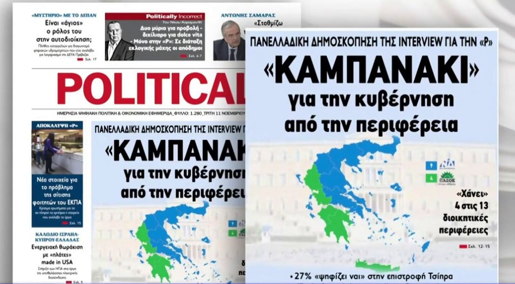 Τηλεοπτικά δίκτυα και ενημερωτικές ιστοσελίδες έκαναν εκτενείς αναφορές στη δημοσκόπηση της Interview που διενεργήθηκε για λογαριασμό της εφημερίδας «Political», καθώς αποτέλεσε ένα ηχηρό προειδοποιητικό καμπανάκι για τη ΝΔ που φαίνεται να χάνει 4 στις 13 περιφέρειες.