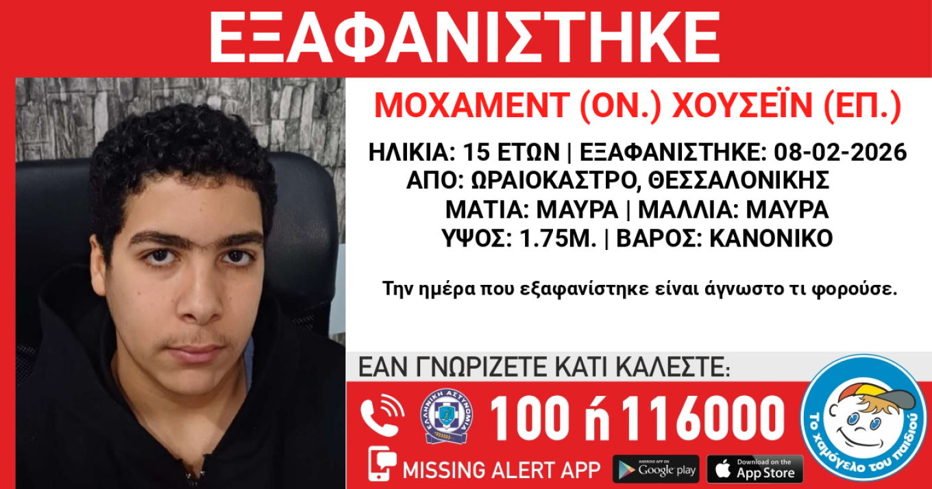Συναγερμός έχει σημάνει στις Αρχές και στο «Χαμόγελο του Παιδιού» για την εξαφάνιση του 15χρονου Μοχάμεντ Χουσεΐν, τα ίχνη του οποίου χάθηκαν την Κυριακή, 8 Φεβρουαρίου, από δομή φιλοξενίας ασυνόδευτων ανηλίκων στο Ωραιόκαστρο Θεσσαλονίκης.