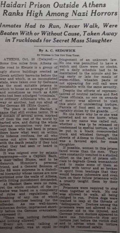 Τα στρατιωτικά φορτηγά ξεκίνησαν εκείνο το πρωί από το Χαϊδάρι προς το Σκοπευτήριο της Καισαριανής, οι κάτοικοι της οποίας άκουγαν τις μηχανές να Μουγκρίζουν». Ήξεραν τι σήμαινε.