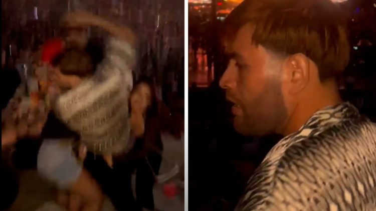 Στο βίντεο ο άνδρας φαίνεται να ρίχνει μια γυναίκα στο έδαφος χτυπώντας την επανειλημμένα, την ώρα που άλλοι συμμετέχοντες προσπαθούν να τον τραβήξουν πίσω.