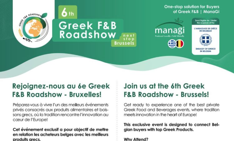 Το 6ο Greek F&B Roadshow – Brussels πραγματοποιείται στις 18 Νοεμβρίου στο Résidence Palace, Restaurant 155 Rue de la Loi με την υπογραφή της εταιρίας «ManaGi» που εξειδικεύεται στη διεθνή διανομή εγχώριων προϊόντων. Στόχος της εκδήλωσης είναι να φέρει σε άμεση επαφή επιλεγμένους Βέλγους αγοραστές με Έλληνες παραγωγούς και εξαγωγείς.