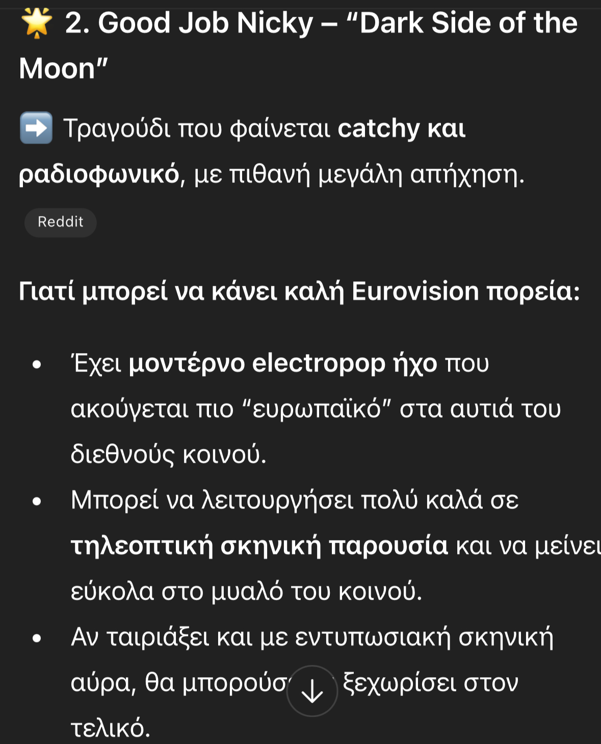 Στη δεύτερη θέση ακολουθεί ο Good Job Nicky με το «Dark Side of the Moon», που το χαρακτηρίζει ως «catchy» και αρκετά ραδιοφωνικό.
