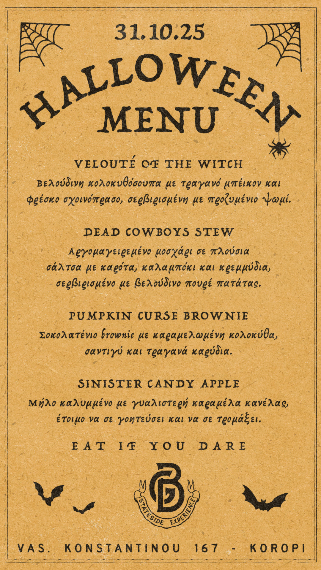 Πείνασες; Ακόμα και γι’αυτό υπάρχει λύση, αφού μόνο για εκείνες τις μέρες 4 «πιάτα» για το χέρι, θα σε περιμένουν να επιλέξεις τι προτιμάς και να τα συνδυάσεις με το αγαπημένο σου ουίσκι ή μπίρα. Μία ζεστή κολοκυθόσουπα «Veloute of the Witch» και μαγειρευτό μοσχάρι «Dead cowboyws stew» απαρτίζουν το αλμυρό μενού. Φυσικά, αν θες γλυκό δε θα φύγεις έτσι, πρέπει οπωσδήποτε να δοκιμάσεις «Pumpkin curse brownie» και το «Sinister candle apple».