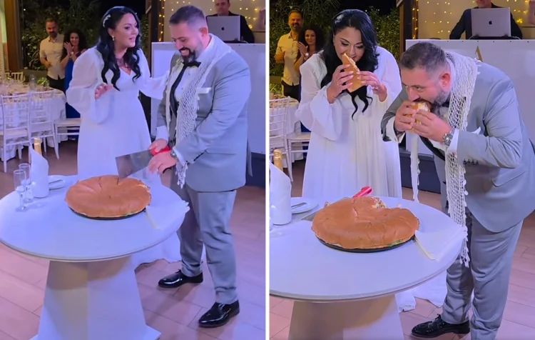 Το burger, που περιείχε λιωμένο τυρί, μπέικον και όλα τα απαραίτητα υλικά, αντικατέστησε την τούρτα, με το ζευγάρι να κόβει το πρώτο κομμάτι παρουσία των καλεσμένων -όπως θα γινόταν παραδοσιακά με το γλυκό.